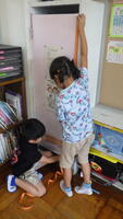 紙テープに長さをうつしとって、教室にあるものの長さをたくさんはかりました。